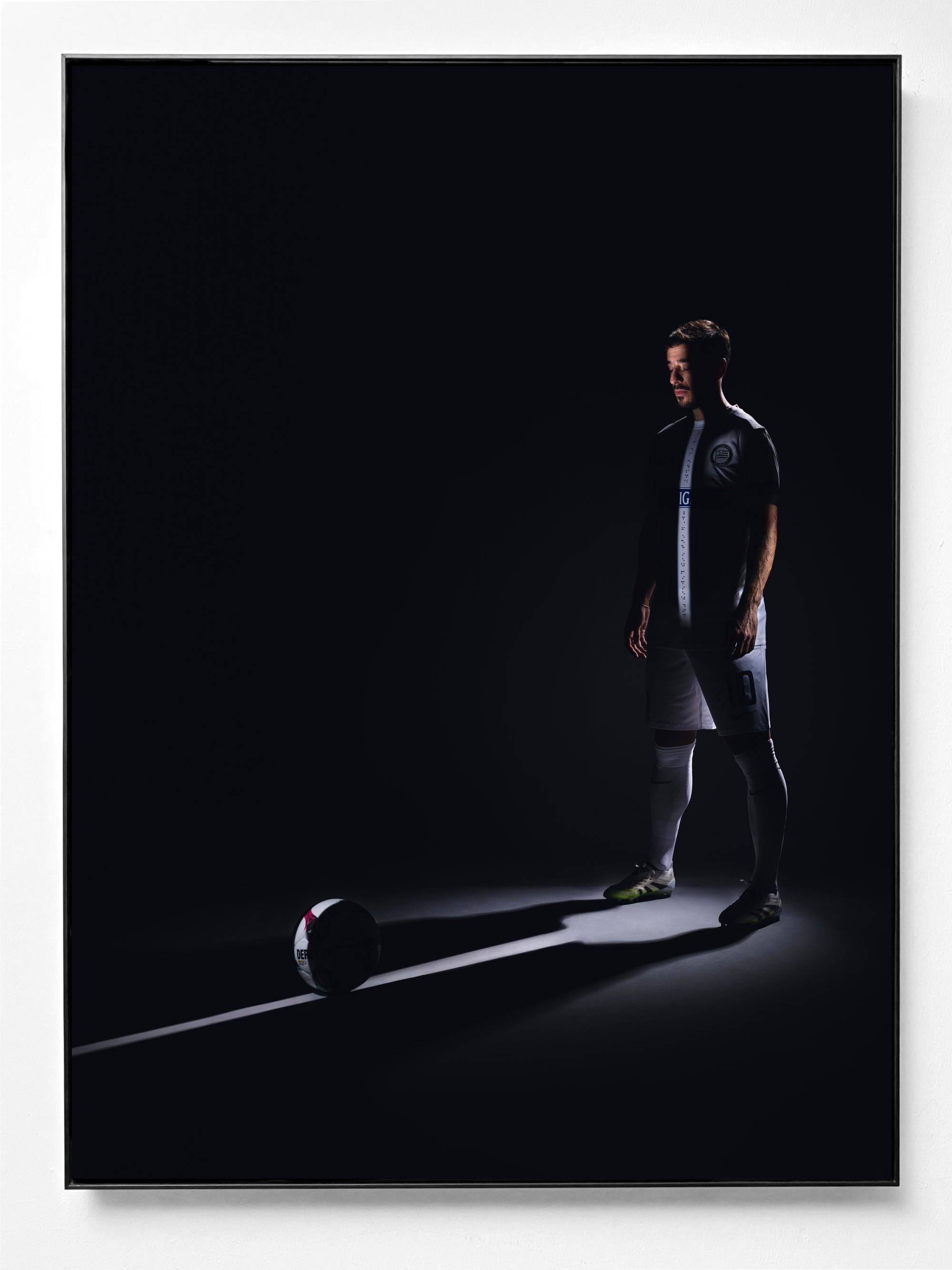 Amid the darkness, a deep sense of introspection prevails: Otar Kiteishvili, Sturm Graz’s midfield playmaker, stands at the penalty spot. The title of the work, “In Manus Regis” (Latin for “Into the Hands of the King”), symbolizes the absolute authority and solitary responsibility the “King of Graz” carries in this decisive moment.