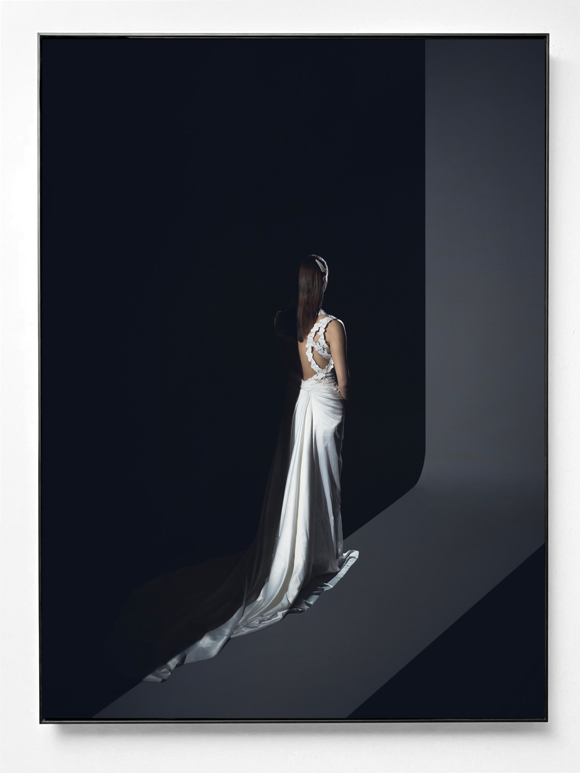 Der helle Lichtstreifen vor der Figur wirkt wie ein Weg nach draußen – ein Aufstieg hin zur Veröffentlichung ihrer genialen Werke, zum Ruhm und zur Gesellschaft. Es ist ein klarer Pfad ins Licht. Doch Emily zögert. Ihre Kraft liegt im Verborgenen, in der Stille ihres Zimmers und im schützenden Schatten. In ihrem weißen Kleid steht sie wie eine Novizin an der Schwelle, während ihr Herz sich zurück in die Sicherheit der Anonymität sehnt. Sie blickt nicht zum Licht; sie verharrt im Dialog mit der Dunkelheit.