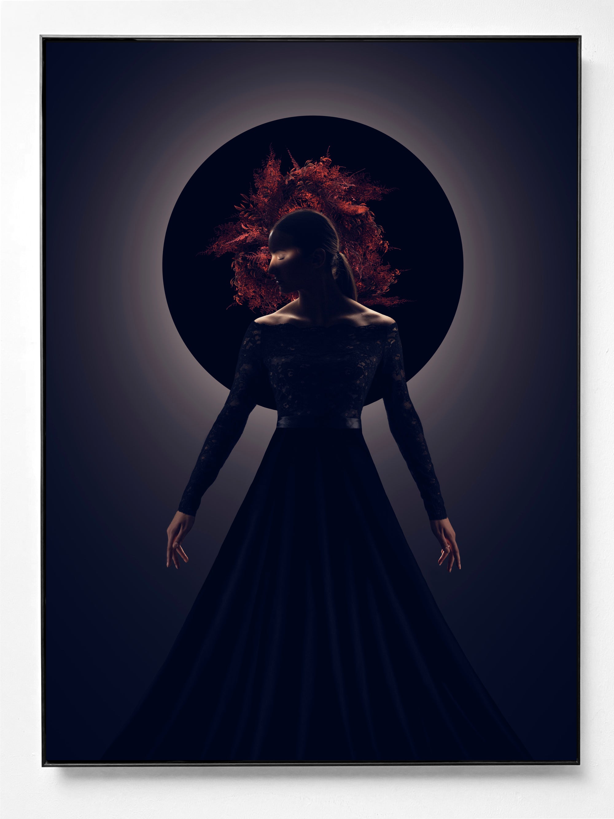 Dieses dunkle, mystische Porträt ist eine Interpretation der österreichisch-schwedischen Physikerin Lise Meitner, die mit ihrer theoretischen Erklärung die Kernspaltung erfand. Ihre silhouettenhafte Figur in einem langen, schwarzen Kleid zeugt von stiller Würde. Hinter ihrem Kopf thront ein dunkler Kreis, in dessen Zentrum eine leuchtend rote, explosive Struktur aus beleuchteten Blumen entfaltet ist. Diese Kombination symbolisiert den "Fluch der Entdeckung": Ihre brillante Einsicht gebar die ungeheure Zerstörungskraft der Atombombe, während jemand anderes (Otto Hahn) für diese Erfindung mit dem Nobelpreis ausgezeichnet wurde. Das Bild visualisiert die tragische Ambivalenz ihres Genies und die schwere Last, die Meitner als Pazifistin und unerkannte Heldin des Atomzeitalters tragen musste.