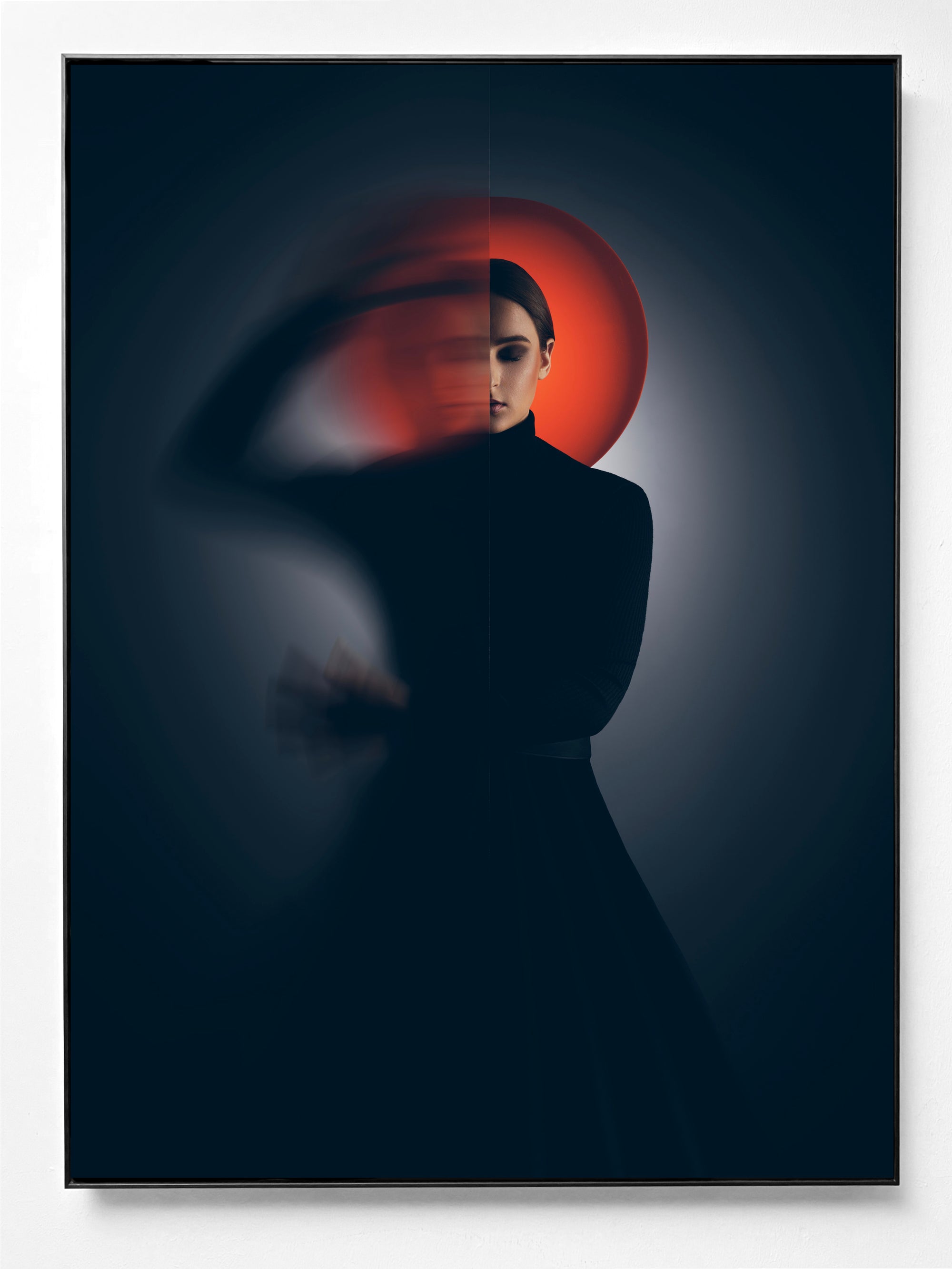 Die rechte Seite zeigt ihre Tagesgestalt: scharf gezeichnet, gefasst und in der kühlen Realität verankert. Es ist die Maske derjenigen, die funktioniert, während die Welt um sie herum weitergeht. Doch im Schein des roten Lichts wird sie zu ihrer eigenen Gefangenen.